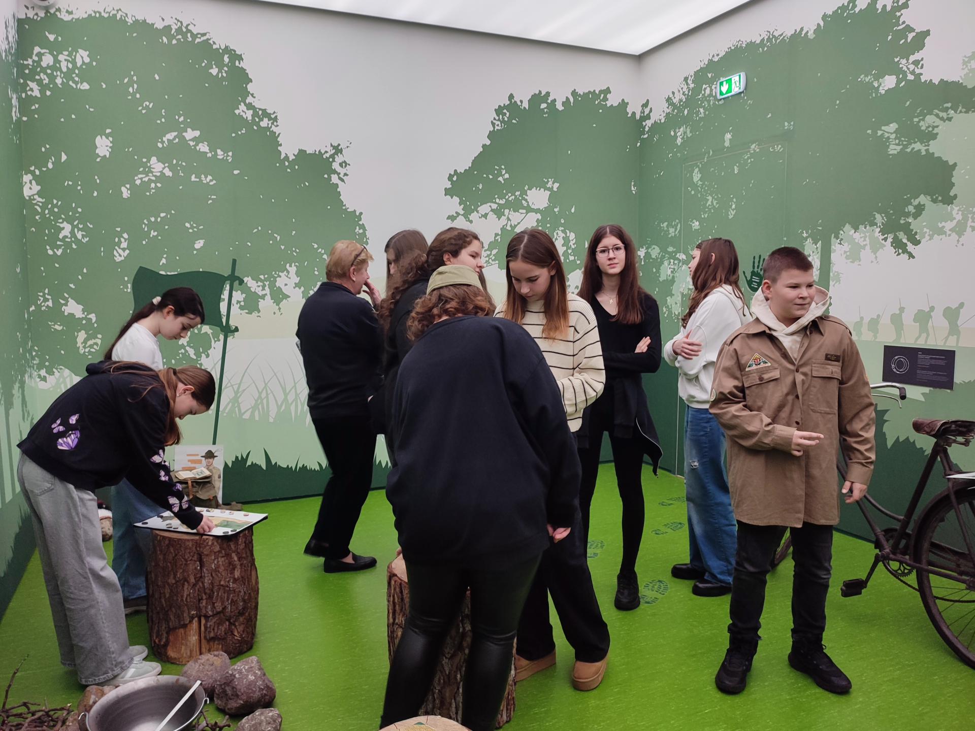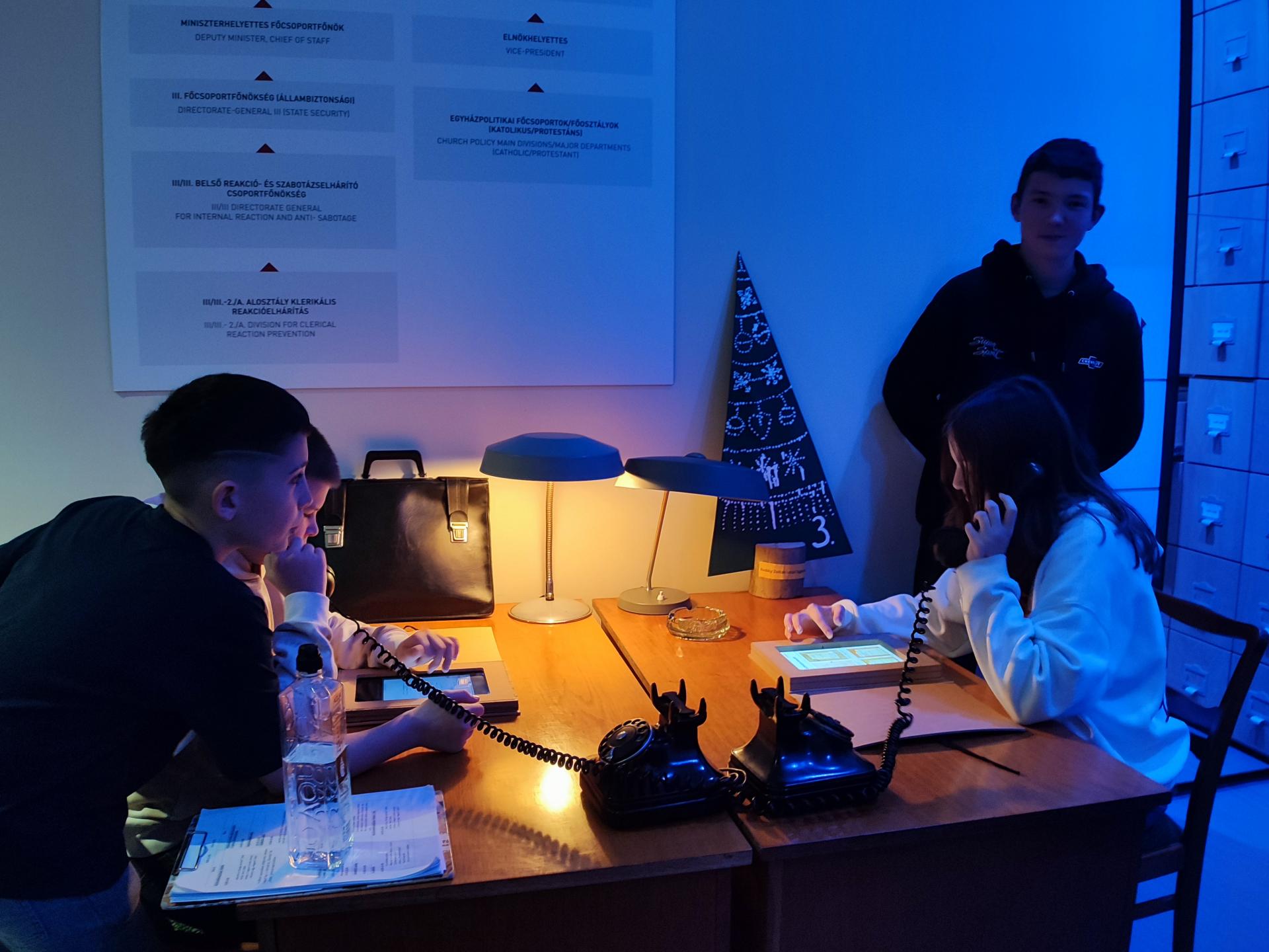A csoport a kiállítás termein végighaladva megismerkedhetett a korabeli propagandával, a sajtó szerepével, a cserkész- és úttörőélettel, a zenével, a divattal, a besúgóhálózat működésével, valamint a fogvatartottak személyes tárgyaival.