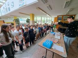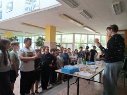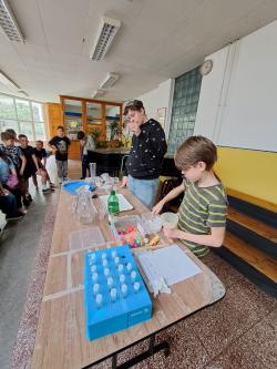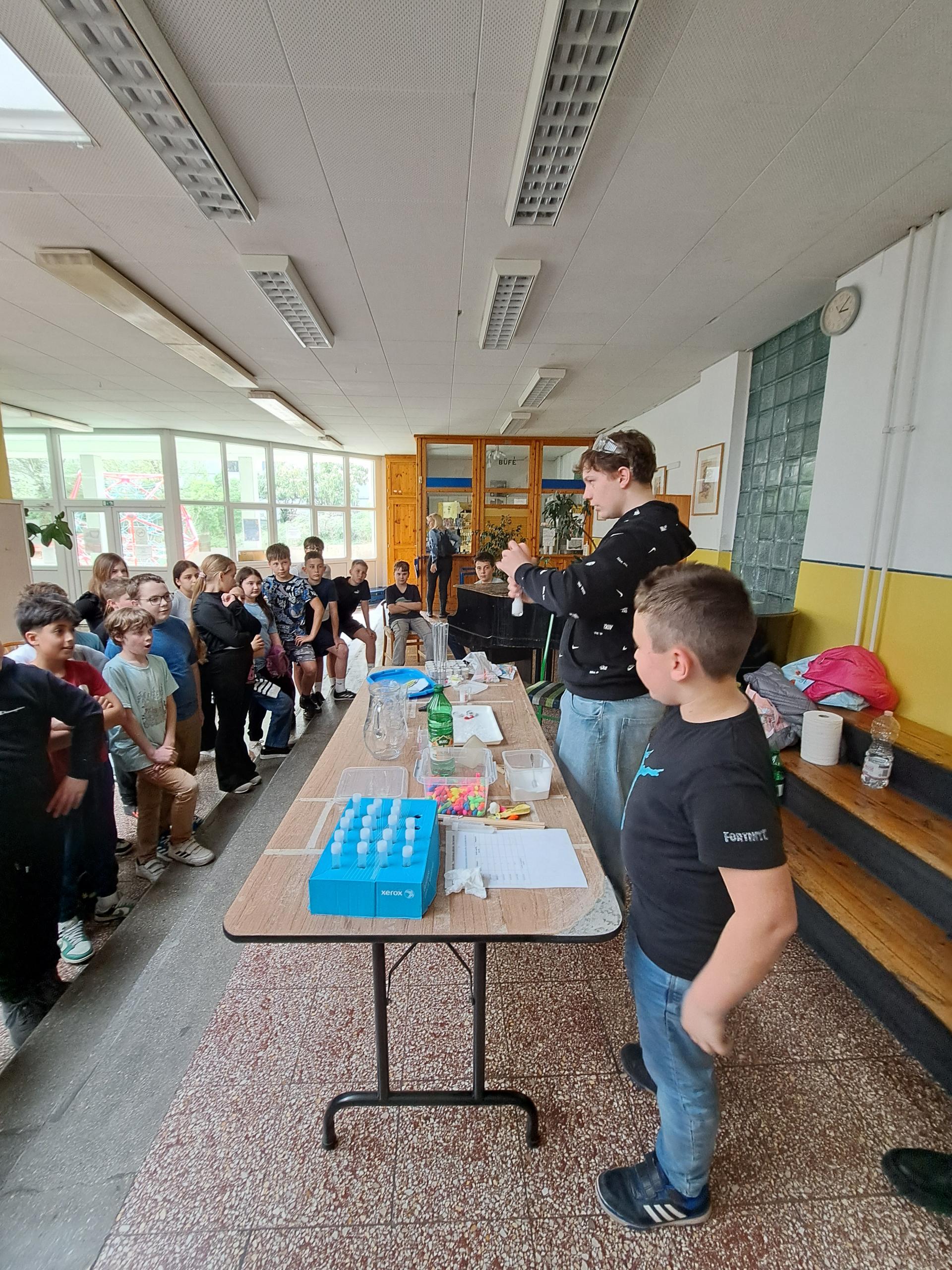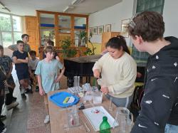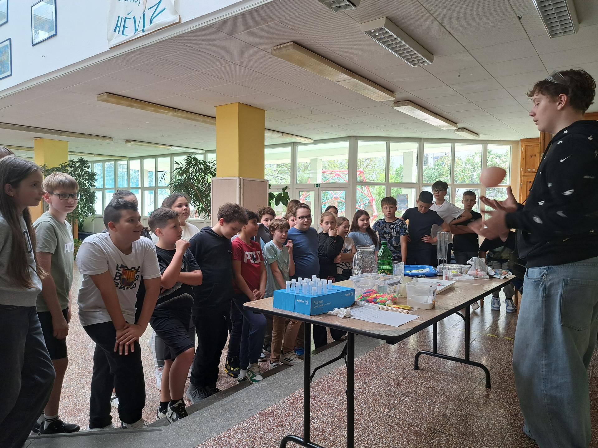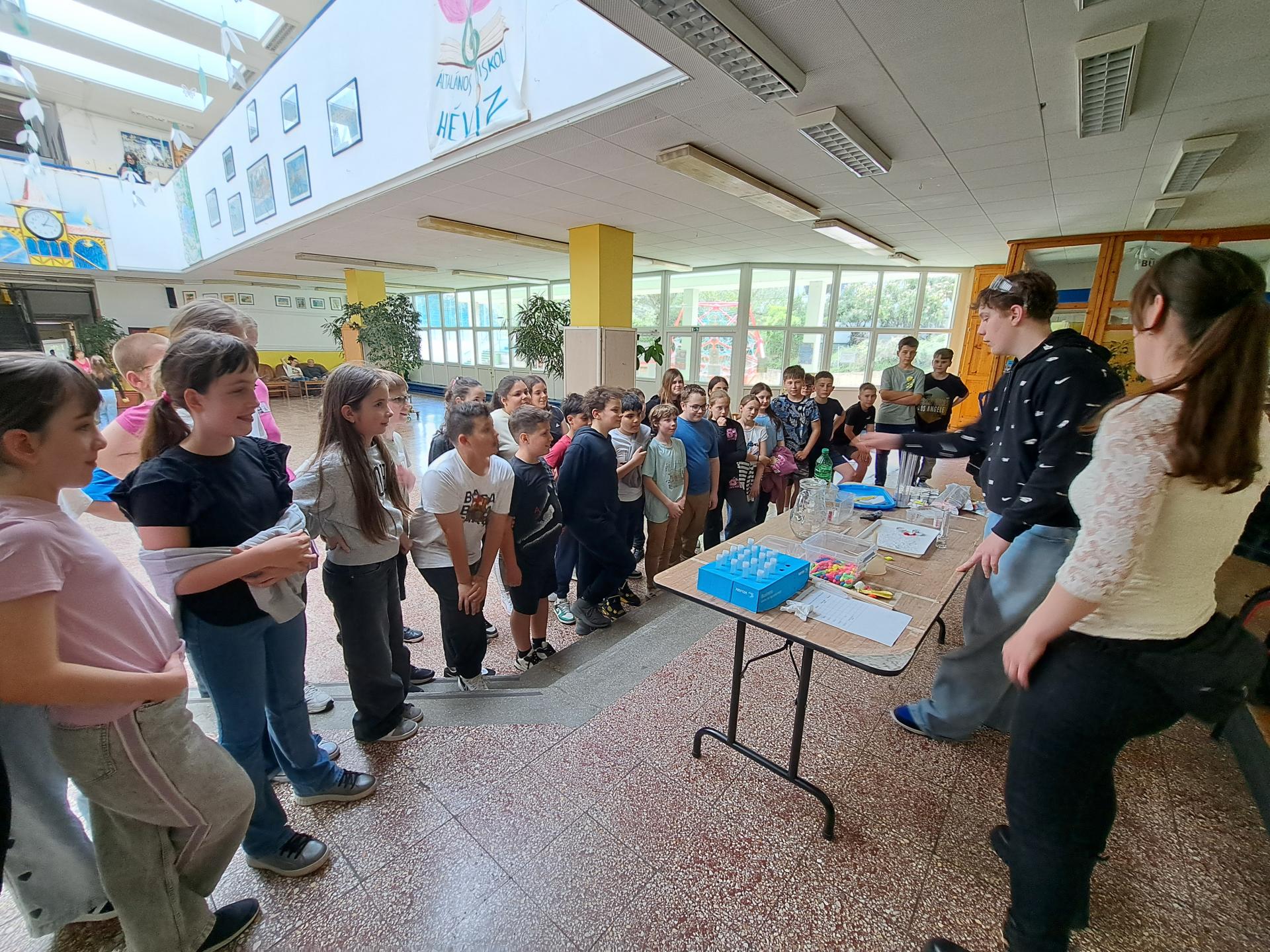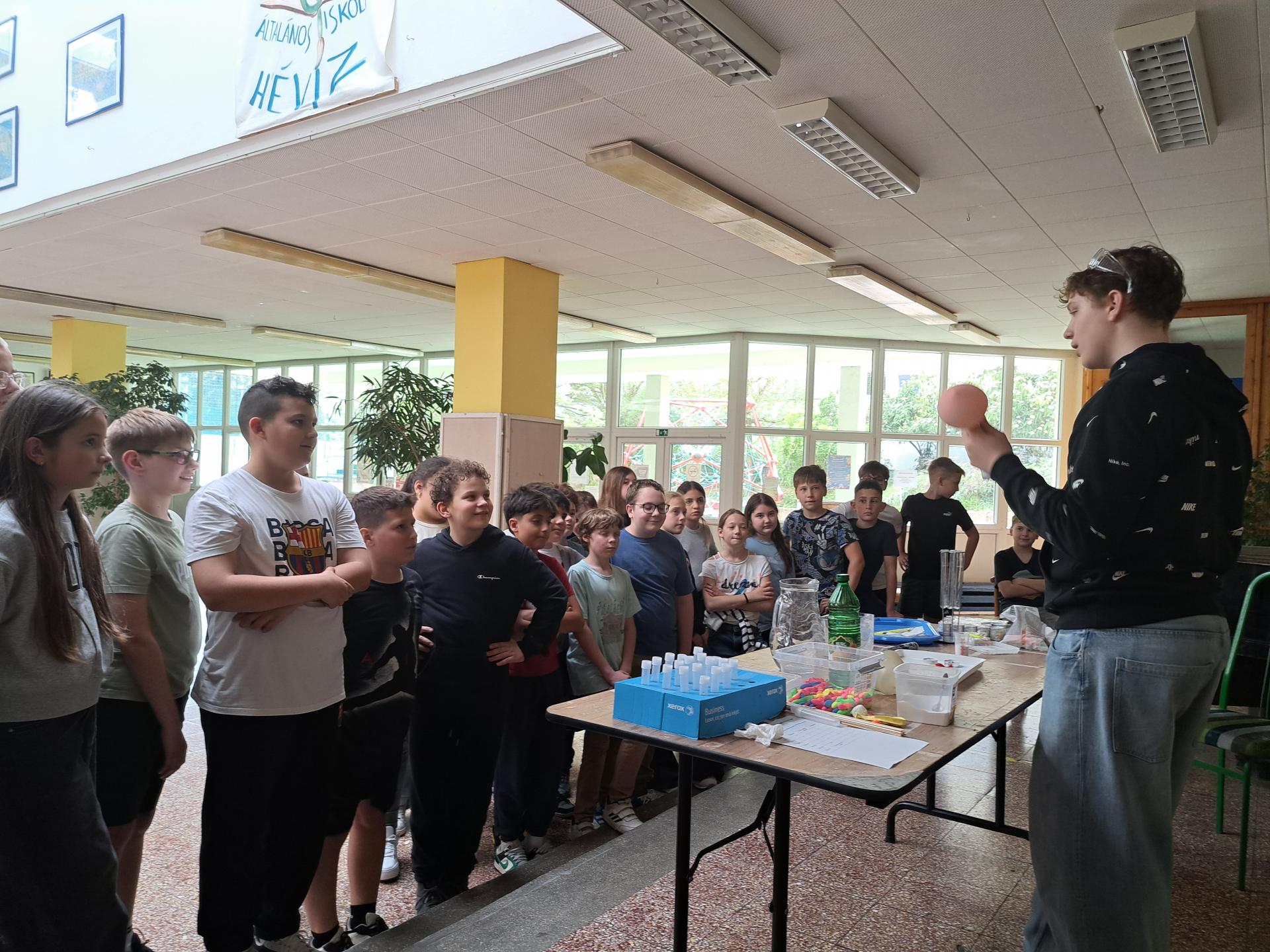 A rendezvényhez kapcsolódóan iskolánk tanulója, Vasas Ottó mutatott be látványos fizikai kísérletet: szódabikarbóna és ecet segítségével a gyerekek lufit fújtak fel és megtanulták, miért fejlődik gáz, ha ezt a két anyagot összekeverjük.