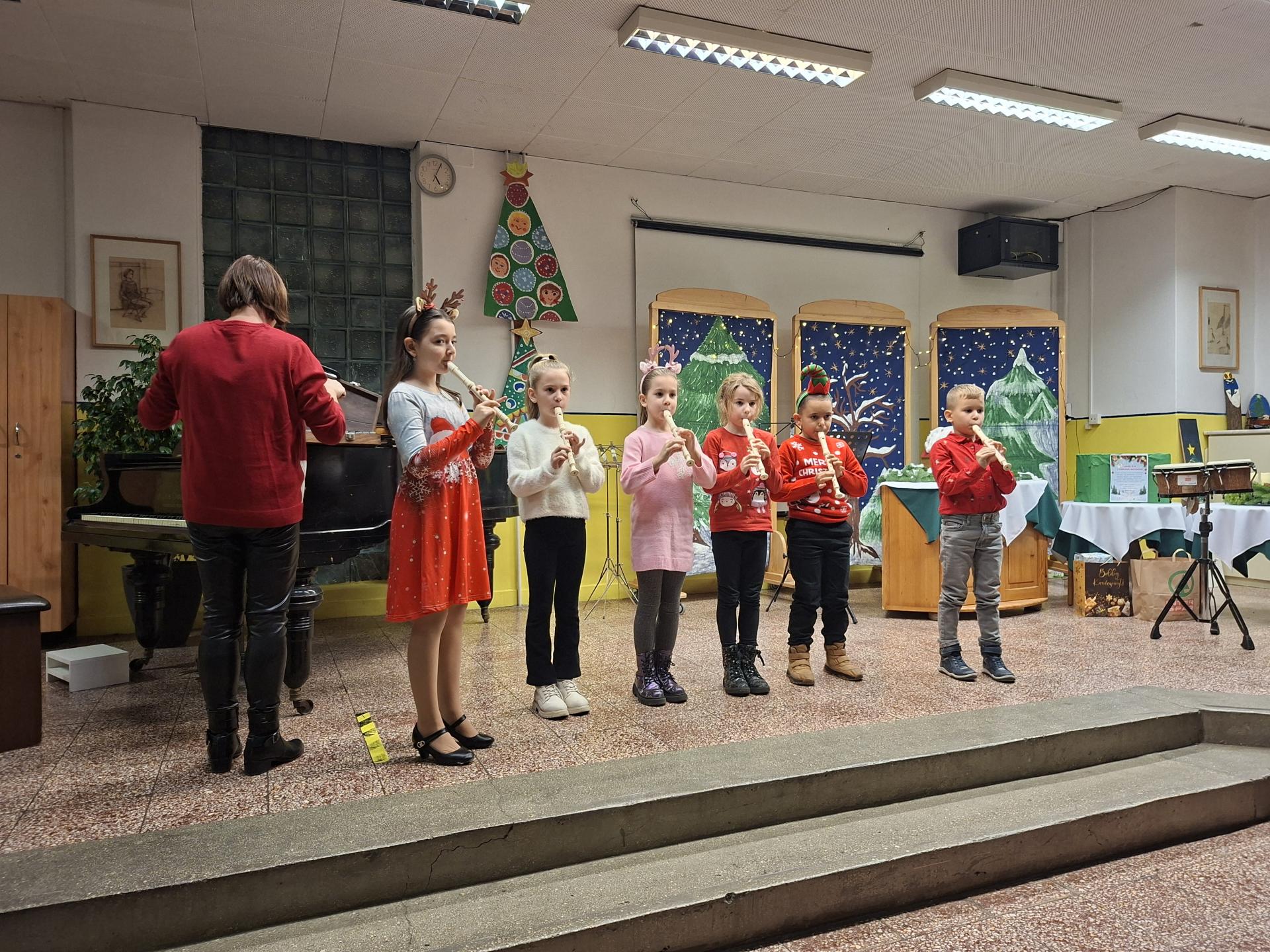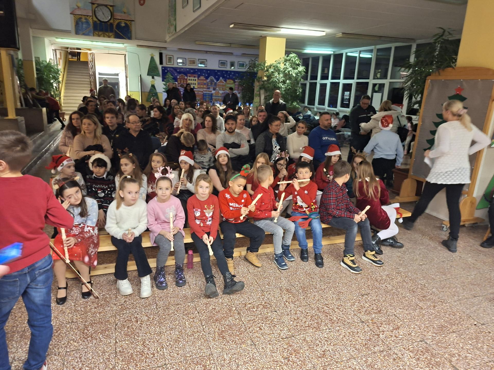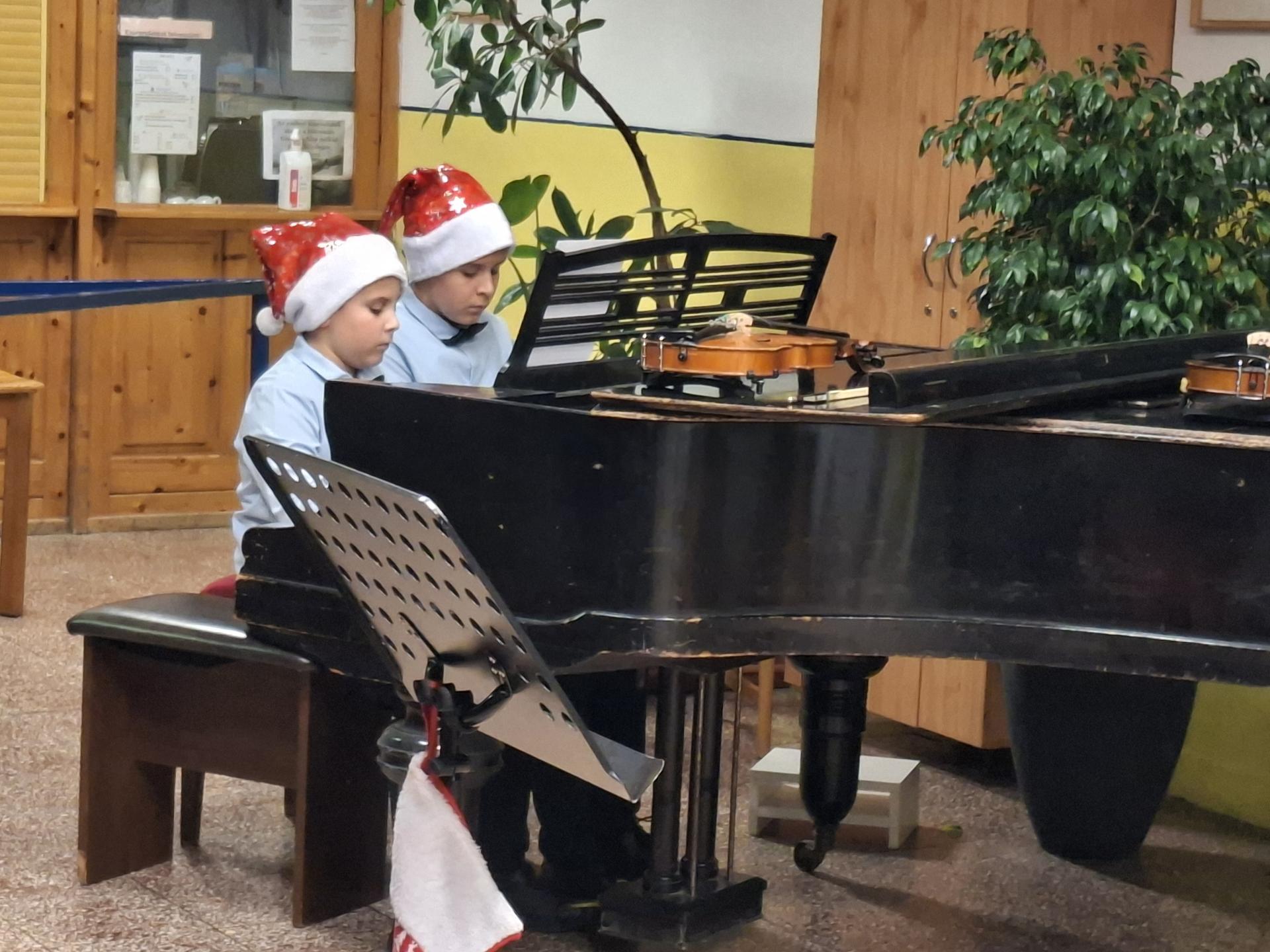 Vidám mikulás- és karácsonyi dallamok töltötték be az iskola auláját december 4-én délután. A hegedűk, furulyák, fuvolák és a zongora hangjára idő előtt meg is érkezett "pikulájával" a "nótás" mikulás, aki apró ajándékkal kedveskedett a gyermekeknek.