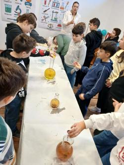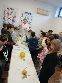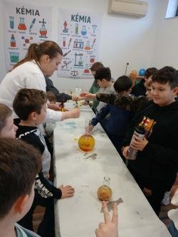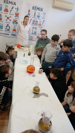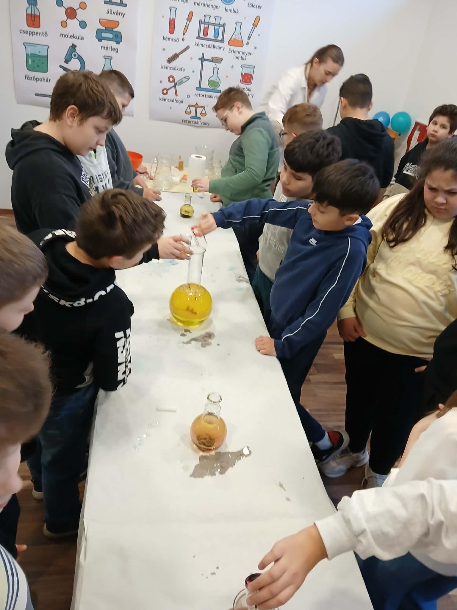 A múzeumlátogatás után egy rendhagyó kémiaóra következett, amely során a tanulók egyszerű konyhai alapanyagok segítségével végeztek látványos kísérleteket. Készítettek lávalámpát, megfigyelték, miért alszik el a gyertya, ha egy befőttesüveget helyeznek fölé, valamint ecet és szódabikarbóna összekeverésével gázképződést idéztek elő, amely még a lufikat is felfújta. A kísérletek nagy sikert arattak, a gyerekek lelkesen figyelték a jelenségeket.
