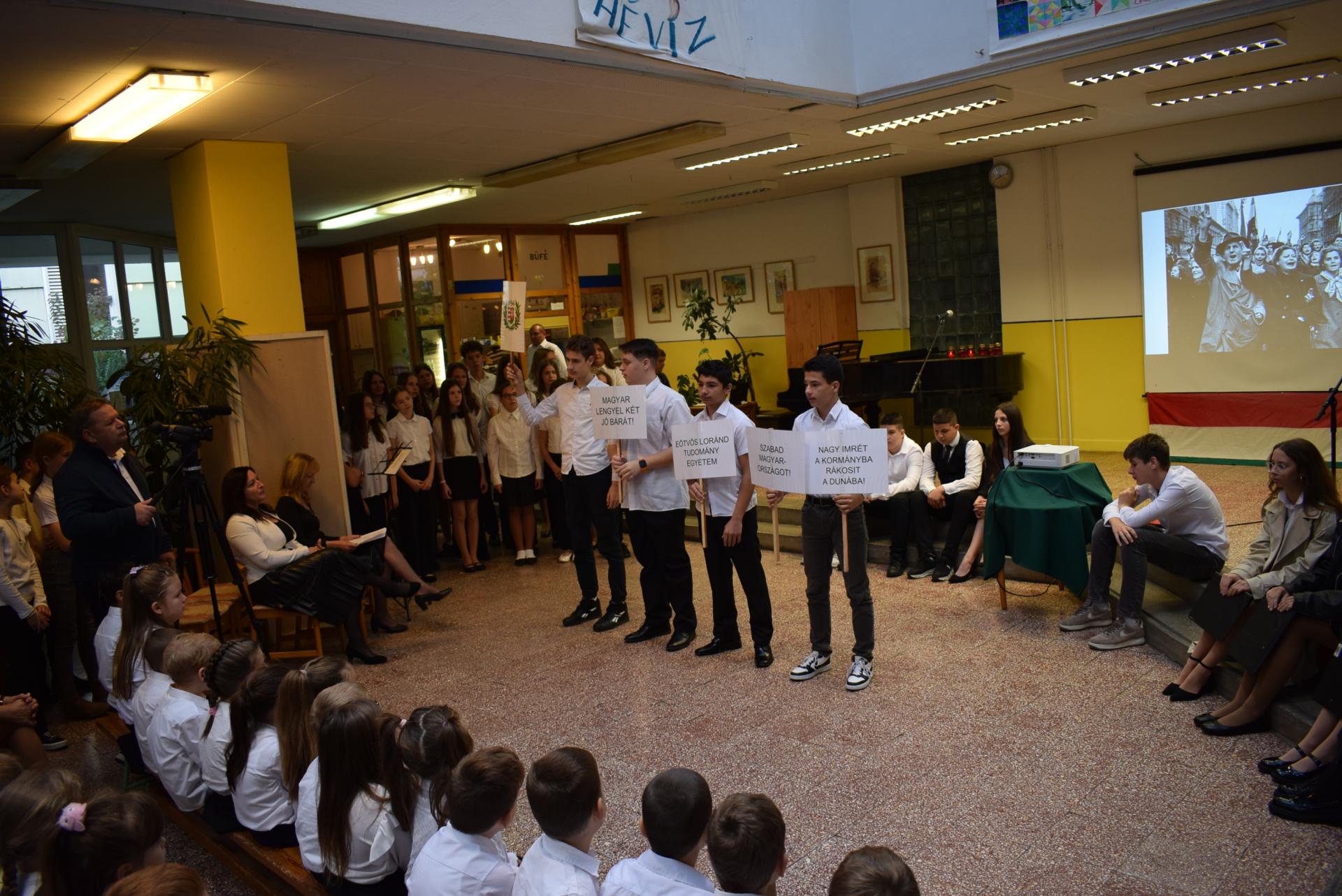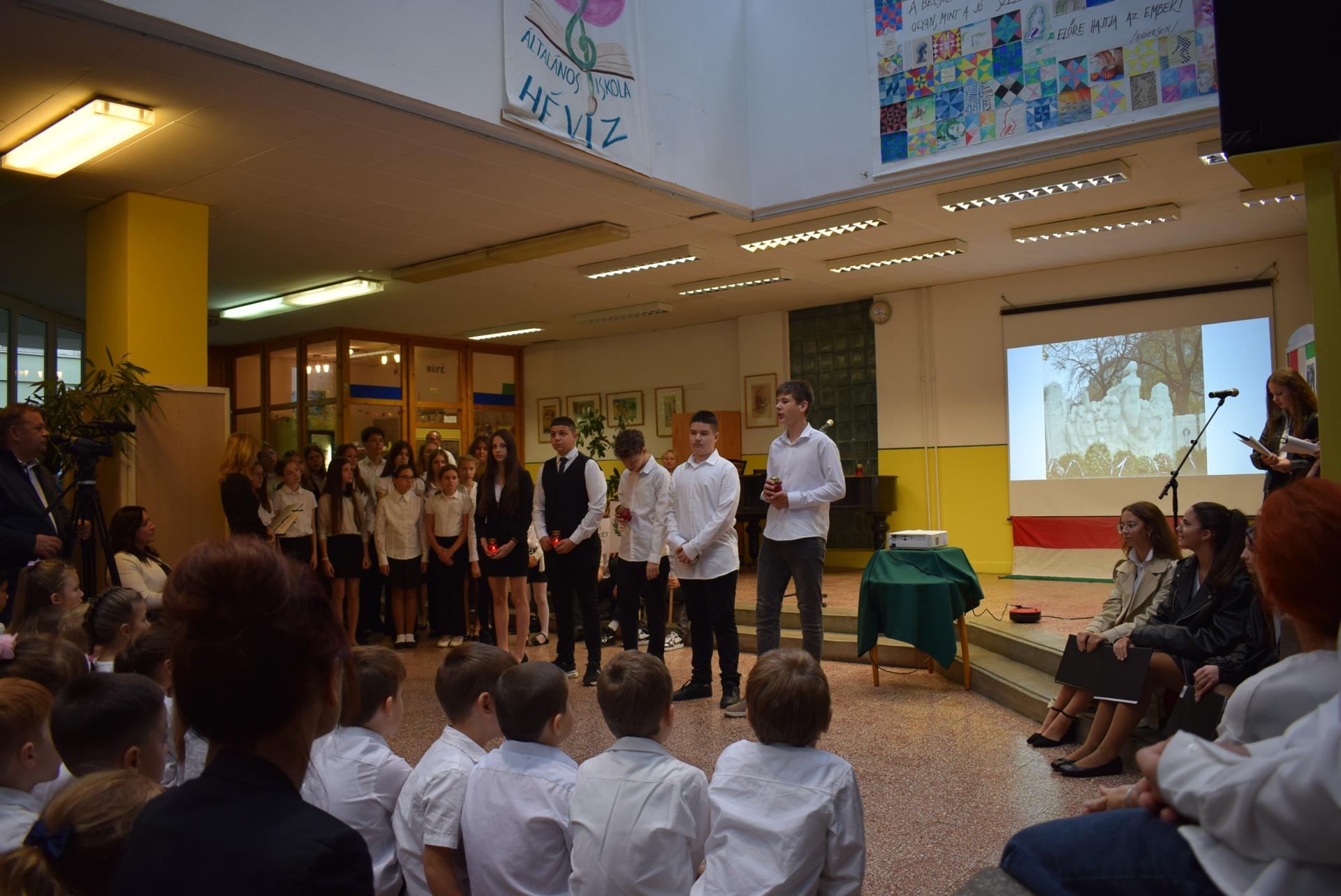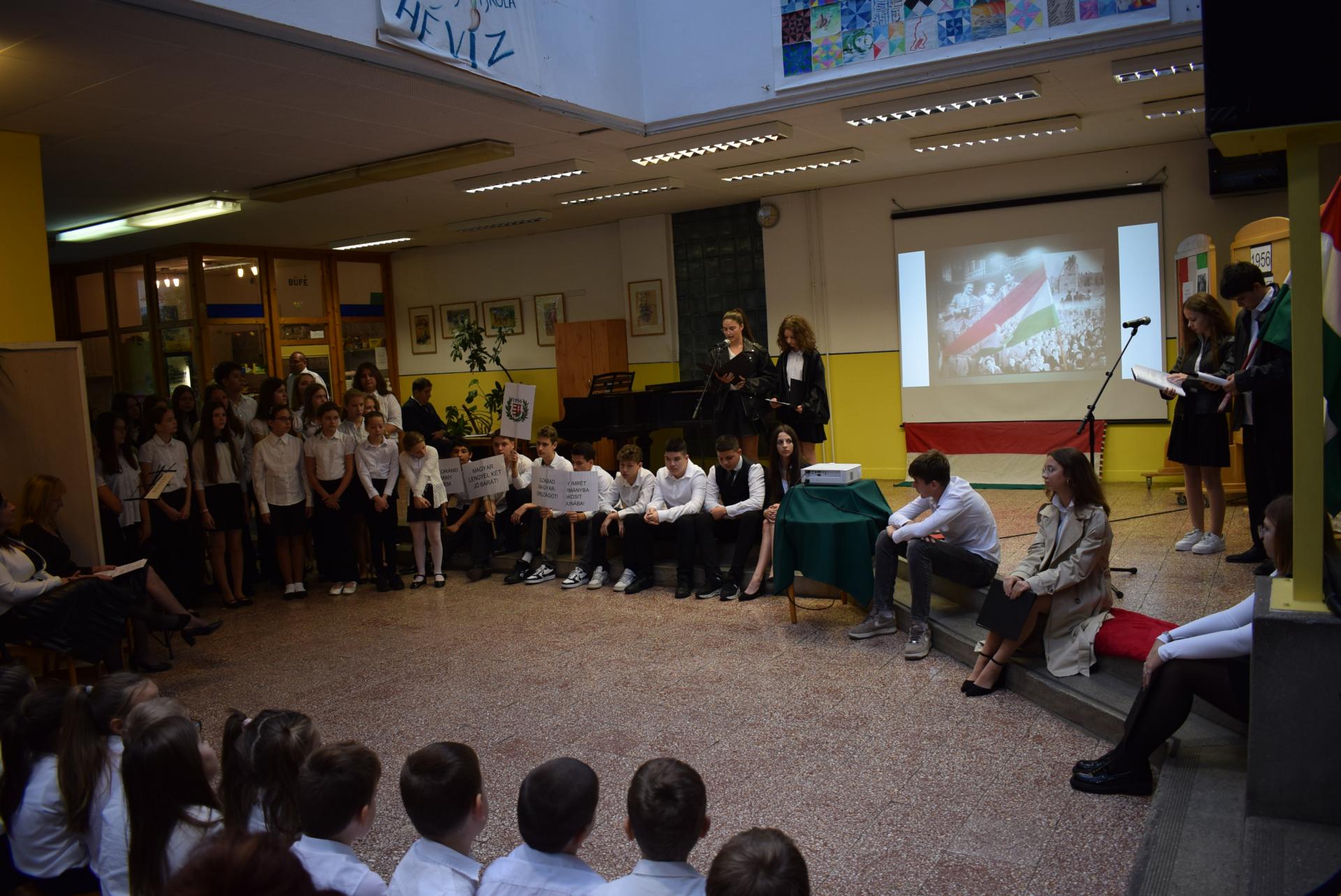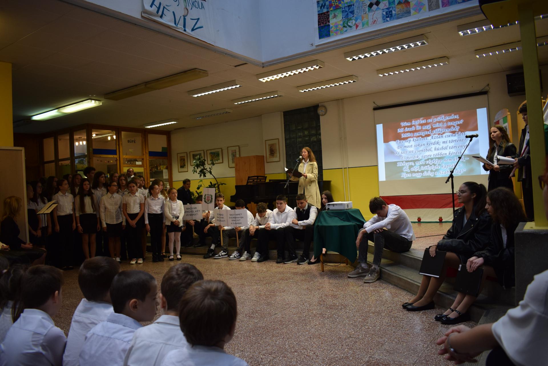 Galériák Október 23-i megemlékezés iskolánkban 2025. október 22., szerda @ 14:19 Hagyományainknak megfelelően idén is a nyolcadik évfolyamosok készültek ünnepi műsorral nemzeti ünnepünk tiszteletére. A délelőtt során ellátogattak hozzánk az óvodások is, akik egy kis részletet láthattak az ünnepi műsorból. Kapcsolódó galéria Október 23-i megemlékezés iskolánkban Megosztás